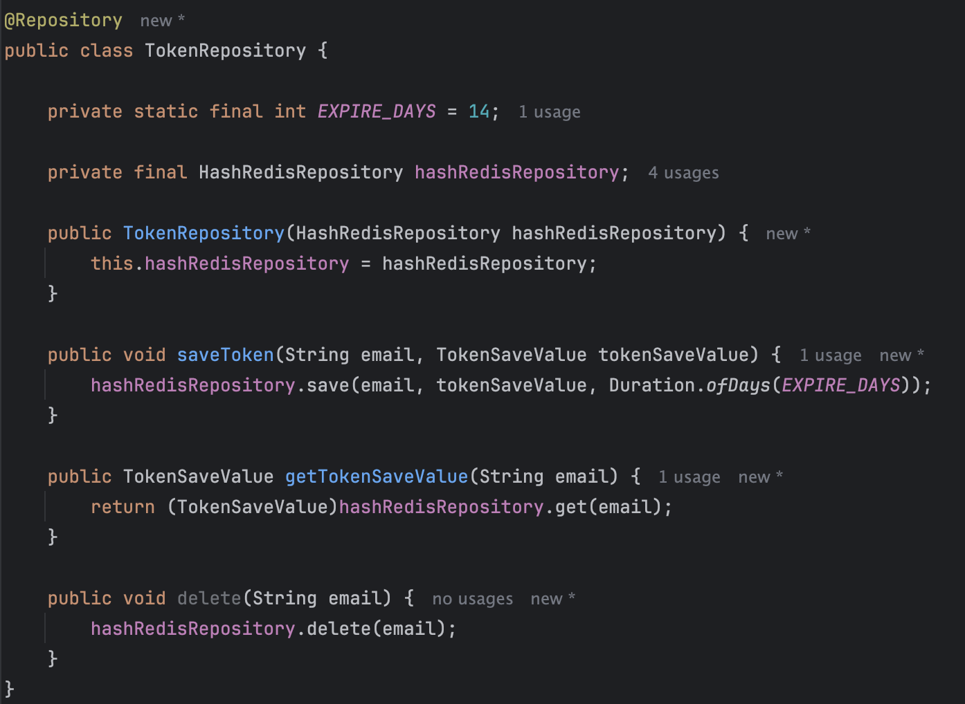Redis는 Hash 기반의 자료구조를 사용하여 토큰을 저장 및 만료할 수 있도록 하였습니다.
